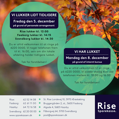 Fredag den 5. december lukker vores afdelinger lidt tidligere.Mandag den 8. december holder alle afdelinger lukket på grund af internt kursus. Telefonen er åben mellem kl. 10.00 og 16.00.